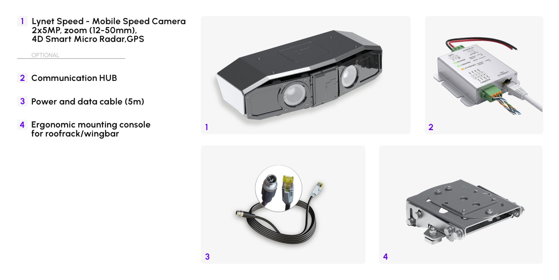 Lynet Speed requires a PoE+ capable router and appropriate in-vehicle power supply components such as an inverter. No external processing unit or additional speed measurement device is required, as all core functions operate onboard.