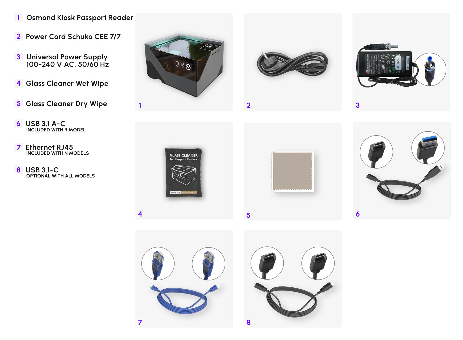 The Osmond Kiosk can scan ICAO-compliant documents, including passports, ID cards, and visas. It also supports 1D and 2D barcodes, as well as optional RFID and smart card reading.